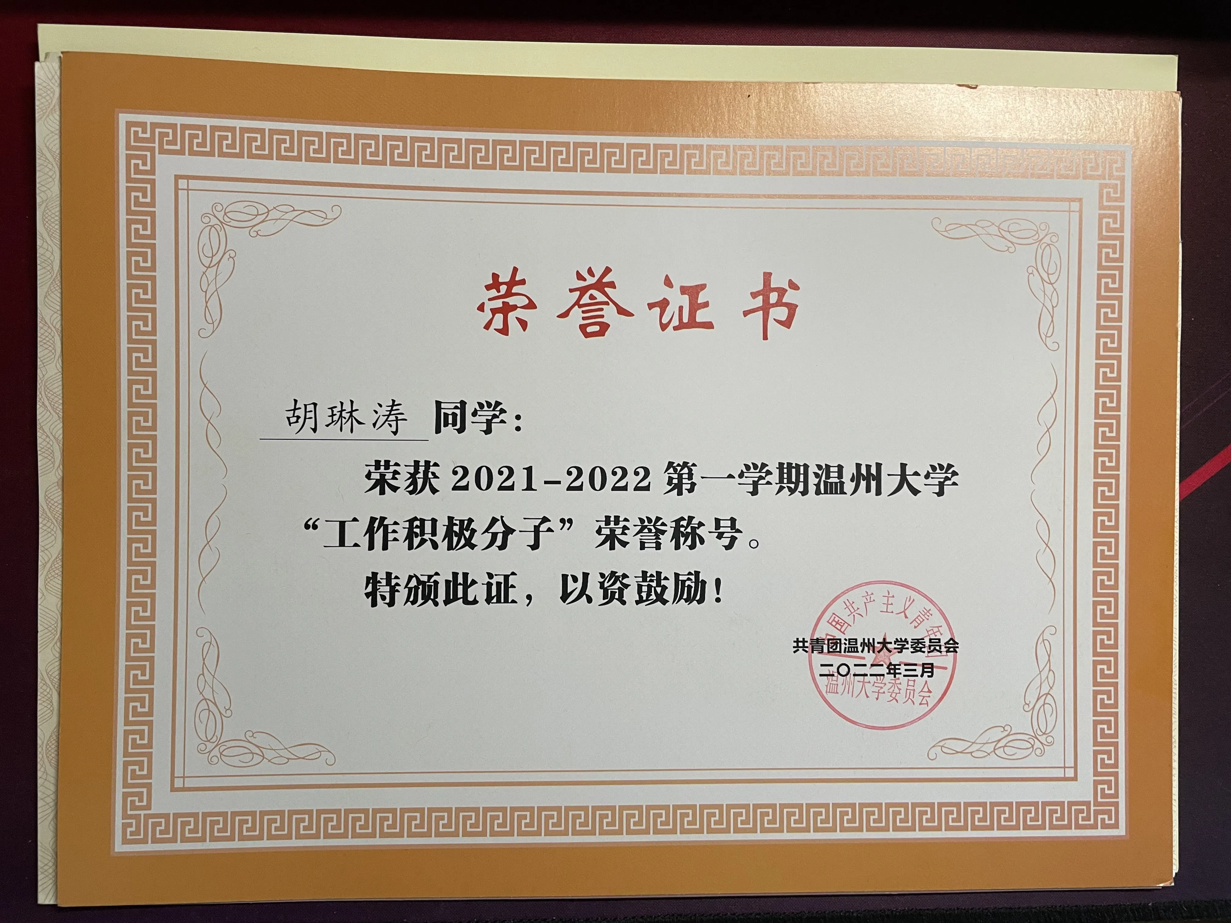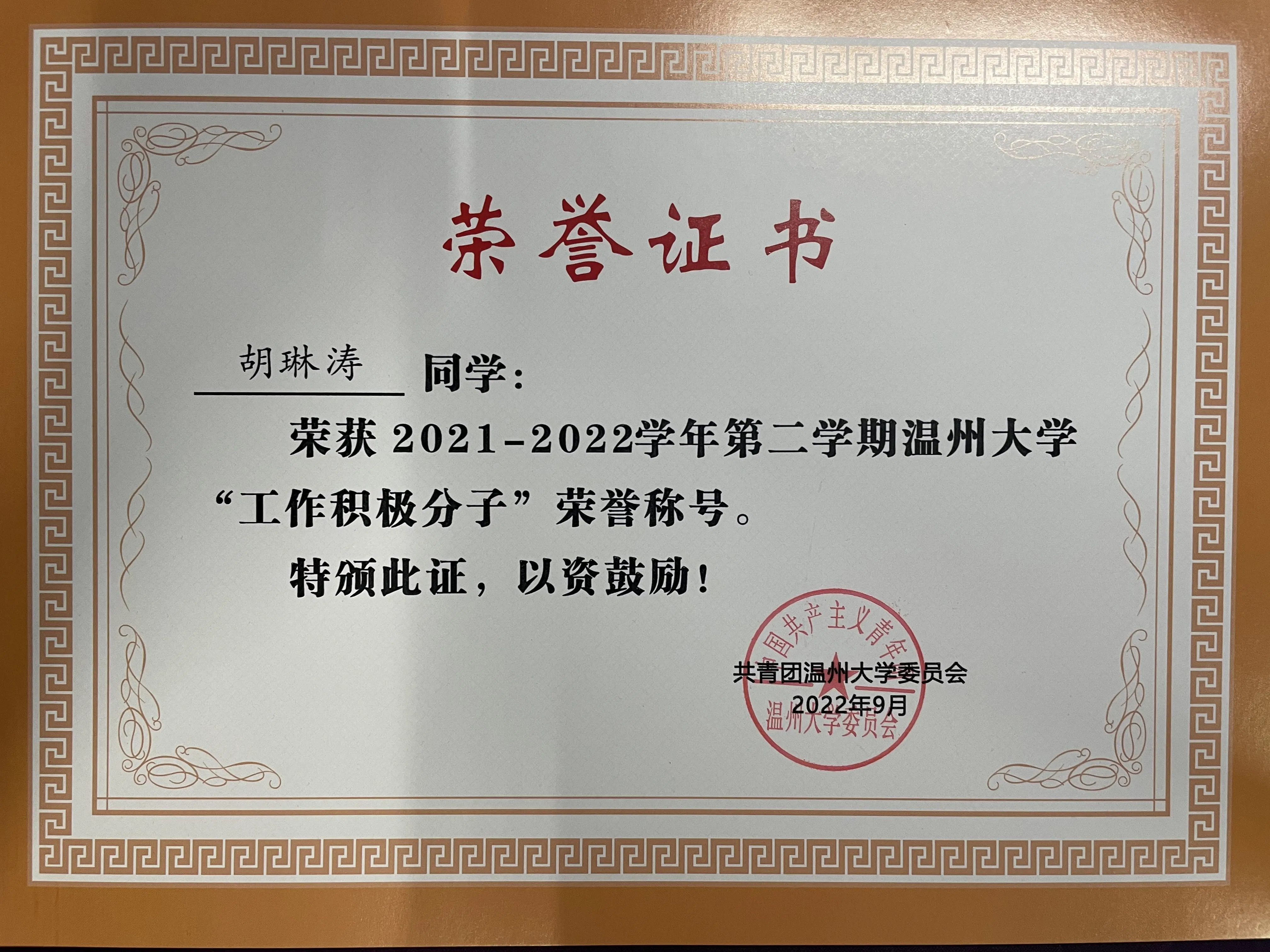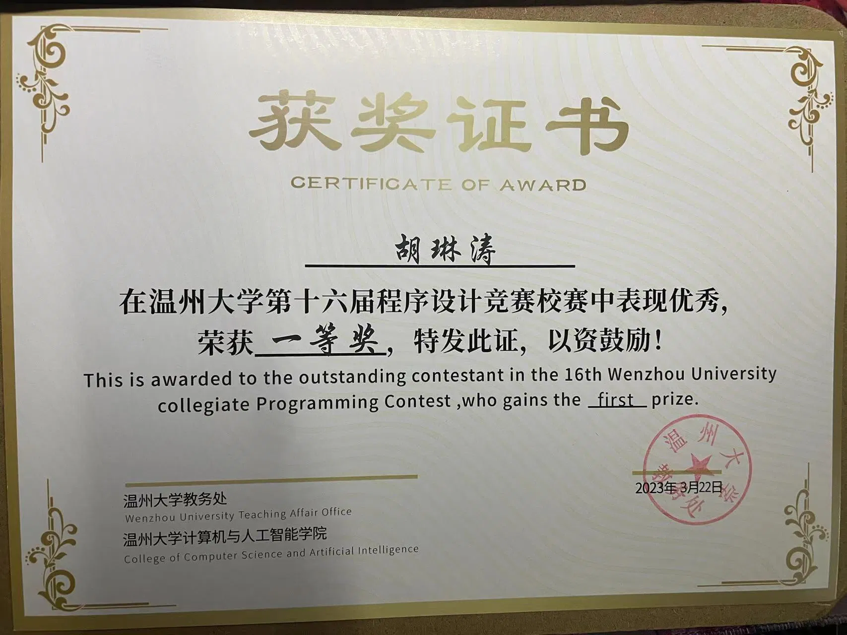 在大学的三年里,我积极参与各类竞赛和活动,并取得了一系列令人自豪的成绩。我曾多次获得温州大学程序设计竞赛一等奖,被评为校工作积极分子,参与团体程序设计竞赛并获得团体奖,以及在暑期社会实践中荣获优秀摄影优秀团队等奖项。这些荣誉不仅是对个人努力的认可,也是对团队协作的肯定,激励着我在未来更加努力地追求卓越。这些奖项的背后是我在大学生活中全身心投入各种活动的付出,同时也是我对自身能力的不断挑战和提升的结果。